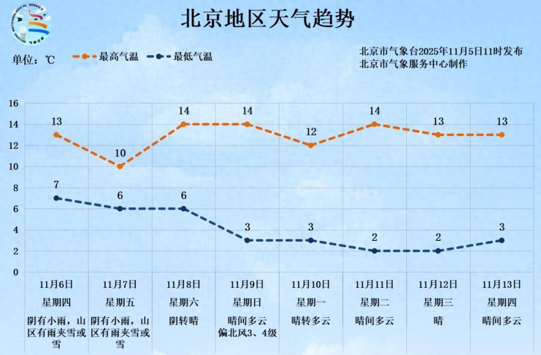 根据最新气象资料分析,受冷空气影响,9日白天有3、4级偏北风,山区阵风明显。目前已进入红叶最佳观赏期,双休日人多拥堵,建议大家错峰前往,注意防风和出行安全。11月6日至11月13日白天最高气温10℃至14℃,夜间最低气温2℃至7℃。
