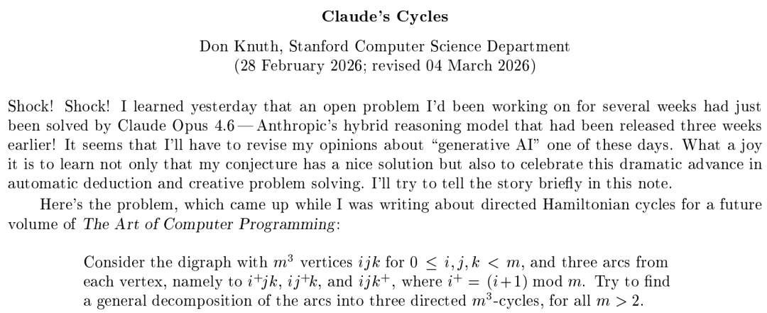 在他近期在斯坦福大学官网上公布的一篇论文《Claude’s Cycles》中,开篇的「Shock! Shock!」非常直白地表达了他对于 AI 强大能力的震惊。