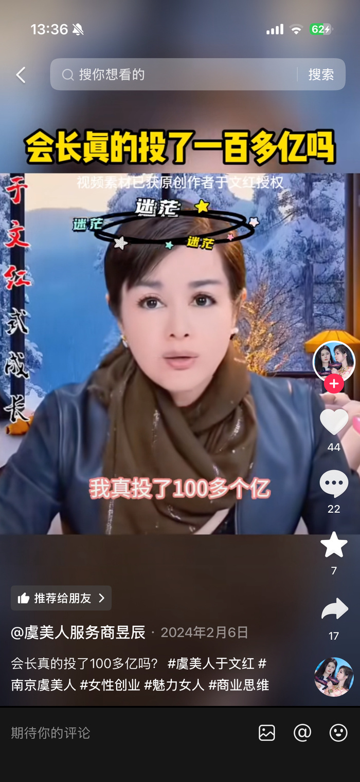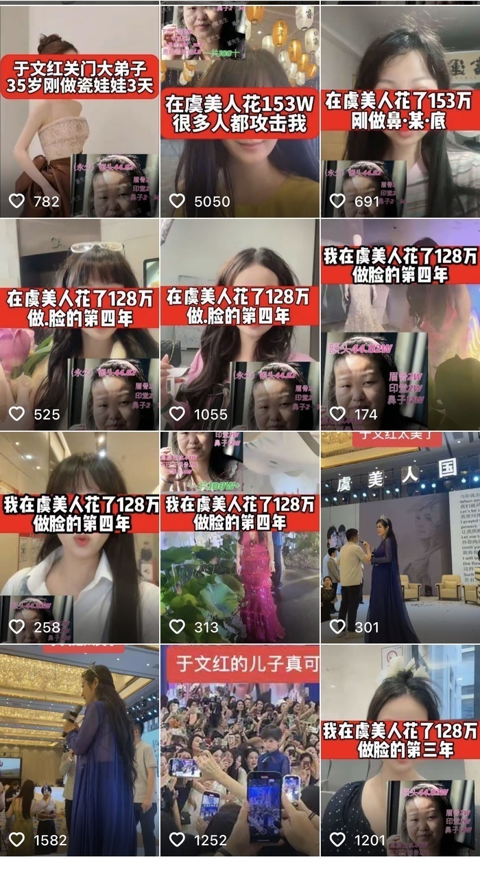 一位自称“于文红亲传弟子”的博主发布了大量“花了400多万整容”的短视频,并向网友宣称赚钱途径是“跟我师父做富豪的生意,每单都是500万起”。这种通过展示巨额消费来拉拢代理的做法,引发了部分网友对其医美效果存在“美颜痕迹”的质疑。