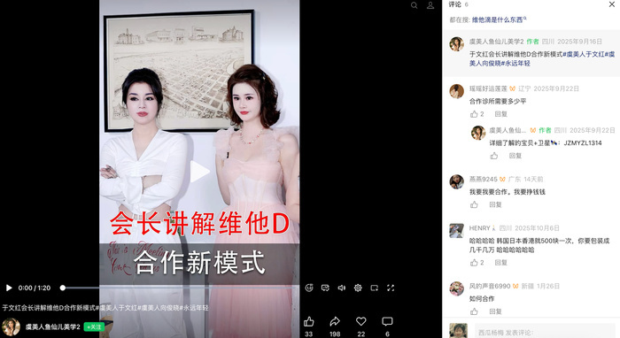 值得注意的是,在部分公开演讲和培训资料中,于文红也曾对市场上流行的“干细胞回输”等项目提出强烈质疑,称其存在合规风险。但在同一语境下,其团队同步推广“维他滴”等静脉注射类产品。这种一边强调他人风险、一边推广自己替代方案的做法,被一些业内人士视为典型的销售策略。