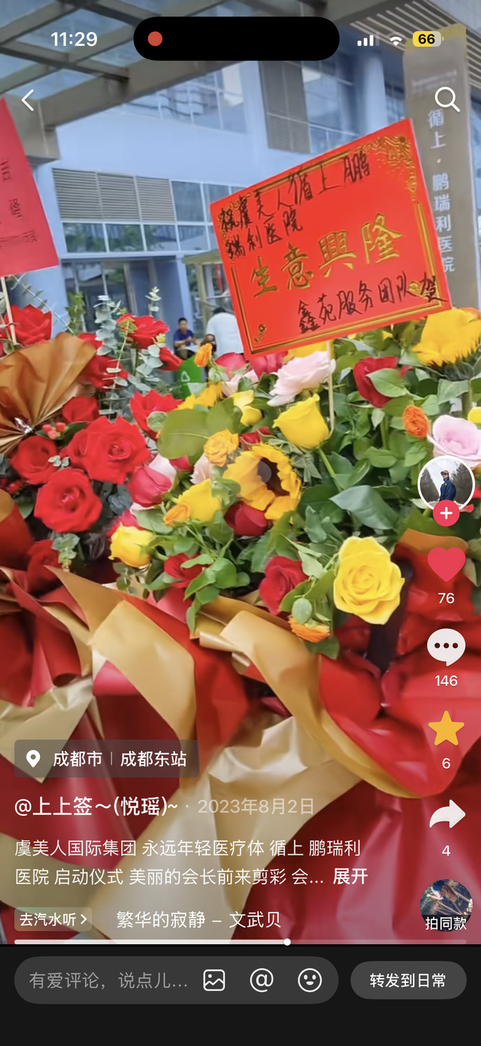 此后,这套合规形象被广泛用于商业推广。在一些公开招聘和招商材料中,相关团队曾使用“背靠两大世界500强”等表述进行宣传引流。在2026年3月下旬的一段公开视频中,于文红的核心弟子为了证明合法性,向公众高调展示了这家合资医院的大楼外立面和内景,宣称:“我们在成都是6万平(方米)的医院,每天都有各种监督部门对我们进行审查!”其公开表述与自身业务的合规现状形成了明显反差。